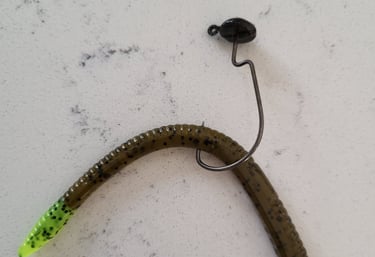 Tip of the month, work the worm. Mainly, wacky and Texas style. If you are getting nothing on Wacky downsize the Worm inch or pinch of the color portion. Additionally, you can insert a rattle along with changing out colors don't give up on Wacky until you have tried at least a few different colors if the water is murky trying going green pumpkin and the June bug. If the water is more clear try going with brighter colors like pink, orange or chartreuse. Try adding a little weight with a Ned EWG. You insert a nail weight and go Neko Rig (especially in grass!) if those mentioned above fail transition to Texas rig style first weight less at full length, and then adding a small bullet weight increase weight as you feel it fall through (if it falls to fast back down).